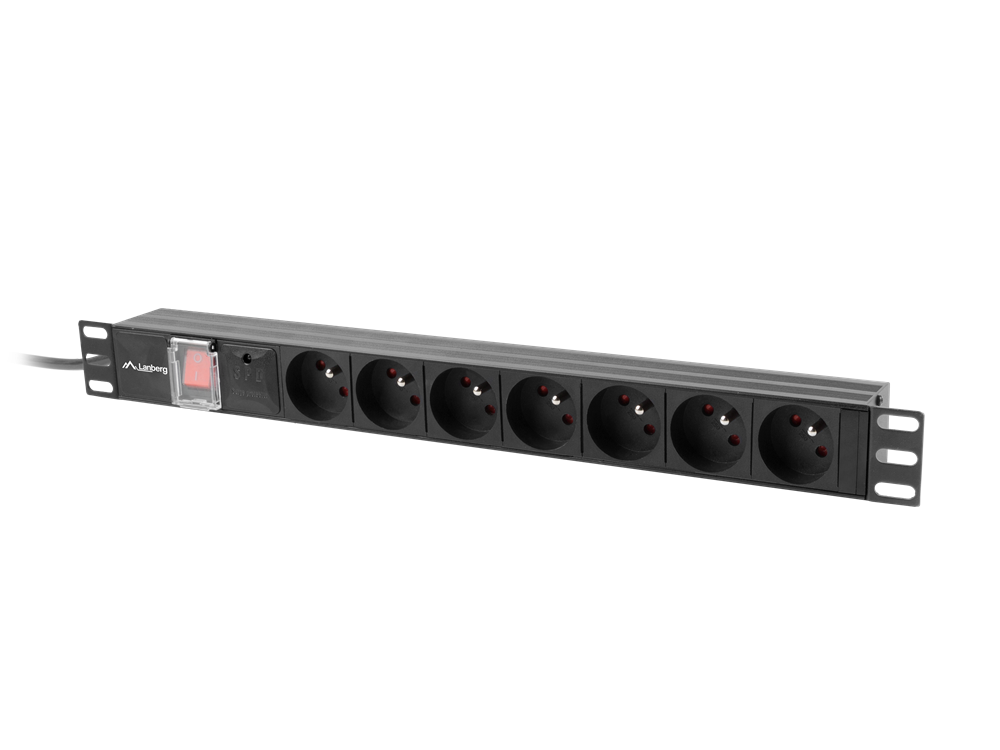 Panneau 19″ 1U 7 prises 2P+T (FR) – 230V 16A – Inter – Câble 2 m C14 – Noir